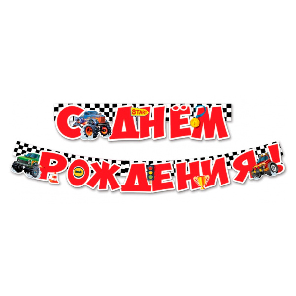 Гирлянда - буквы, с надписью "С Днем рождения!" Внедорожники - декоративное украшение из плотного картона. Изящная надпись придаст особую изысканность праздничному оформлению и станет стильным украшением торжества.